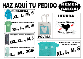A partir de hoy puedes hacerte con cualquiera de los productos de este verano en la TABERNA LEIZALDE (MAMARIGA), haz allí tu pedido. En el material que sale para este verano podrás encontrar: camisetas, camisetas de tirantes, camisetas técnicas, bolsos, sudaderas, ..., anímate y muestra tu solidaridad.