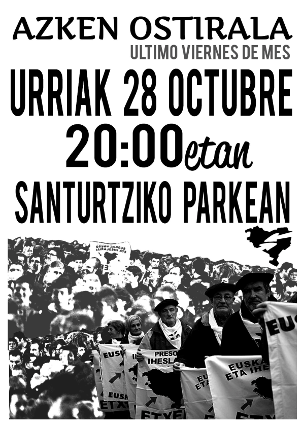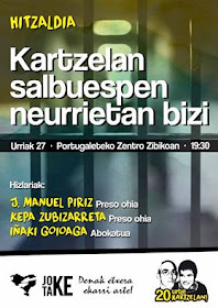 Para seguir con la dinámica "20 urte kartzelan, Aitor eta Iñaki kalera!". Se ha organizado una charla en Portugalete la próxima semana, concretamente el 27 de octubre. En ella se tratara el tema de las medidas de excepción que el estado español y francés aplica a los Presos políticos vascos. Animaros !. Entre todas lo vamos a conseguir.