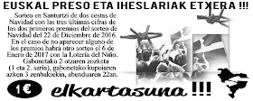 Suerte a todo aquel o aquella que ha colaborado desinteresadamente en apoyo de los represaliados/as políticos de Santurtzi, ya que esperamos que tras el sorteo celebrado hoy, 22 de Diciembre, sea una de las 2 personas que optan a llevarse las cestas que desde el grupo en apoyo a los/as represaliados de Santurtzi se sortean, gracias por supuesto también a la colaboración de muchos vecinos/as del municipio, que bien aportando cada uno su granito de solidaridad, llenando dichas cestas o comprando papeletas para el sorteo hasta agotarlas han ayudado un año mas en estas fechas en las que la ausencia de nuestros seres queridos encarcelados, marca estos días. A TOD@S SUERTE Y ESPERAMOS QUE LOS/AS AFORTUNADOS PASEN CUANTO ANTES A RETIRAR TAN SUCULENTO PREMIO POR LA ELKARTASUN DENDA DE MAMARIGA (Martes, Jueves o Viernes de 17:00h a 20:00h o bien quedando con cualquiera de nuestro colectivo).