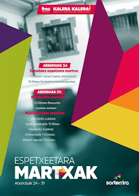 Para seguir con la dinámica "20 urte kartzelan, Aitor eta Iñaki kalera!". Se ha organizado una charla en Portugalete la próxima semana, concretamente el 27 de octubre. En ella se tratara el tema de las medidas de excepción que el estado español y francés aplica a los Presos políticos vascos. Animaros !. Entre todas lo vamos a conseguir.