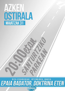 Por otro lado, os animamos a seguir trabajando, o participando en las diferentes iniciativas que se están realizando, como el acto nacional, que bajo el nombre de LASTERBIDEAN se celebrara en Oiartzun el 2 de junio, es una carrera popular, con carácter anual, y que se celebrará cada vez en un lugar diferente de Euskal Herria. Con objeto de que sea un día solidario que aúne fiesta y deporte.